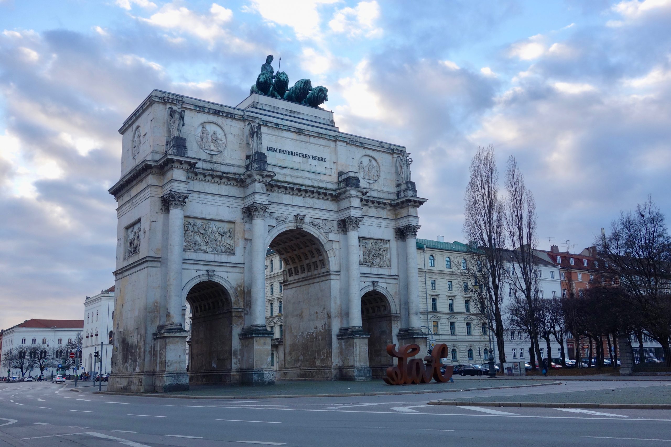 We chose to make use of our transportation pass to return to the Hilton. We walked through the pretty neighborhood to the Ubahn station. The nearest Ubahn station to our hotel appeared to be Siegestor, across the park from our hotel. It gave us a chance to see the Victory Gate, a triumphal arch. On top is a huge lion quadriga. You don’t realize how big it is until you get closer. The arch is 21 meters high by 24 meters wide and 12 meters deep. Yep, that’s big. It was heavily damaged in WWII but restored with a different meaning. Today it is a monument to peace.