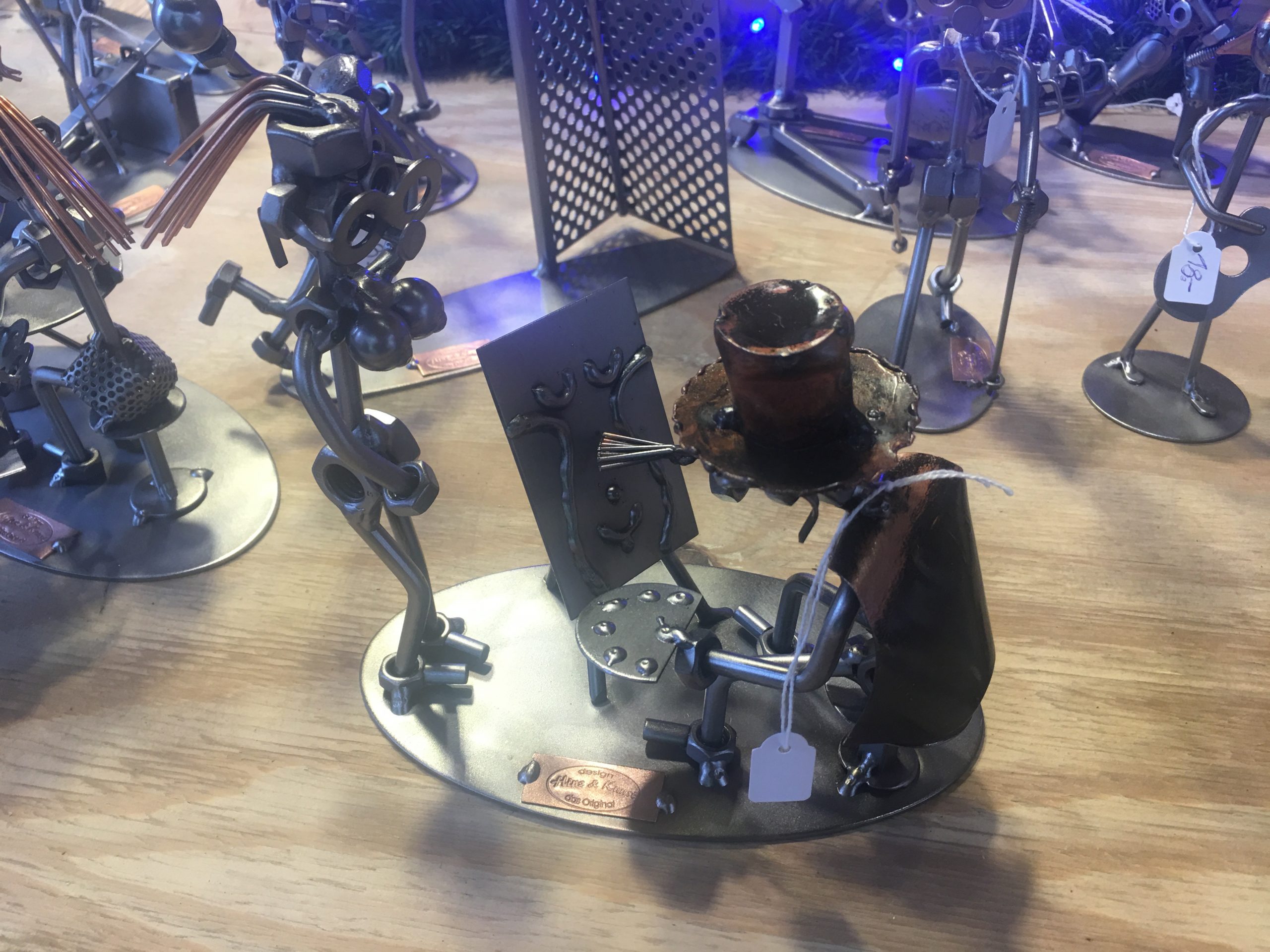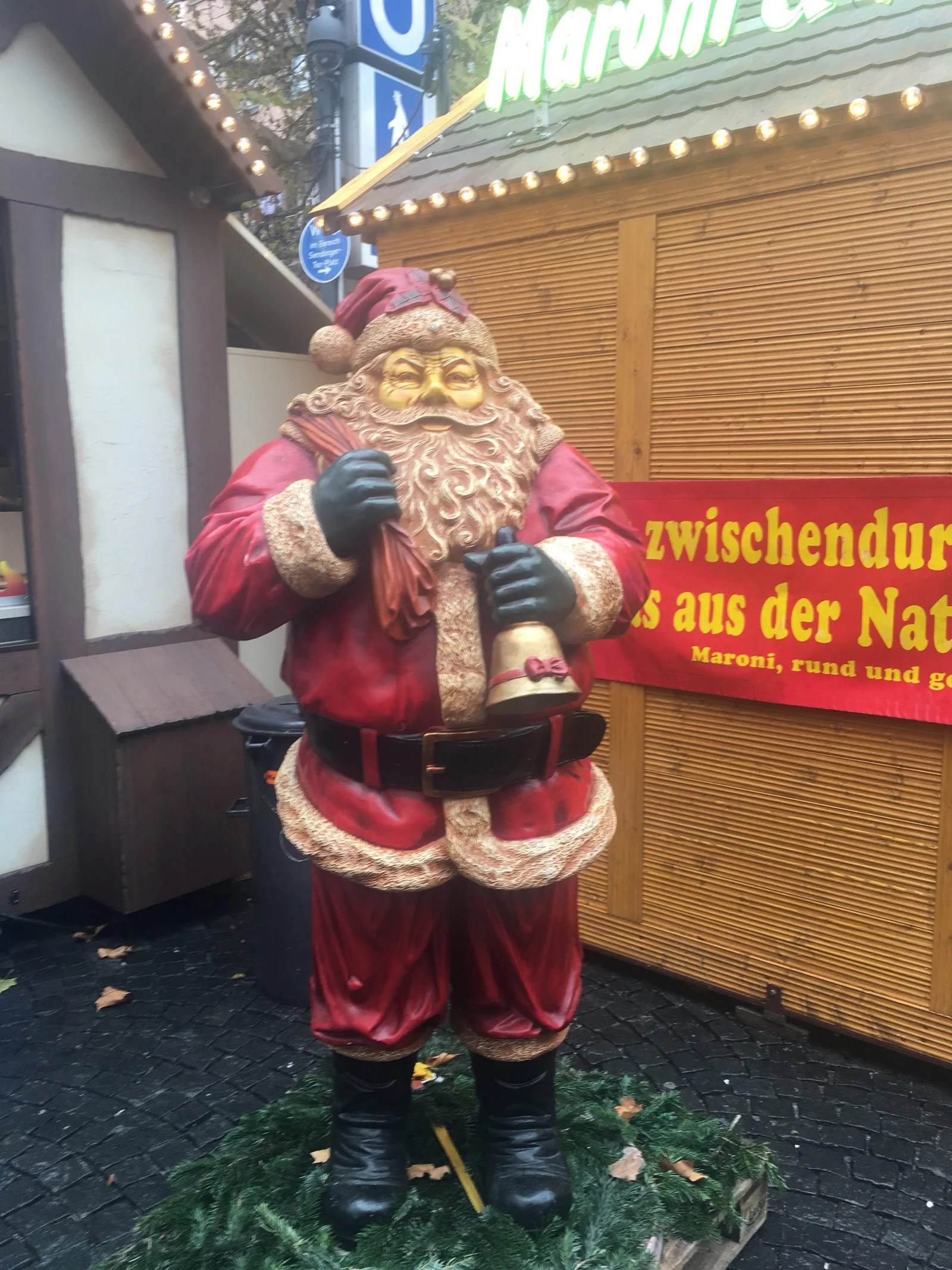 Jan and I had walked a few blocks, so we earned a new and different treat. A Feuerzungenbowle! It’s a traditional drink where a rum-soaked sugar cube is set on fire and drips into the Glühwein. The name means fire-tongs-punch. We had to get one! Look how St Nicholas pointed our way to the heaviest cups we would bring home.