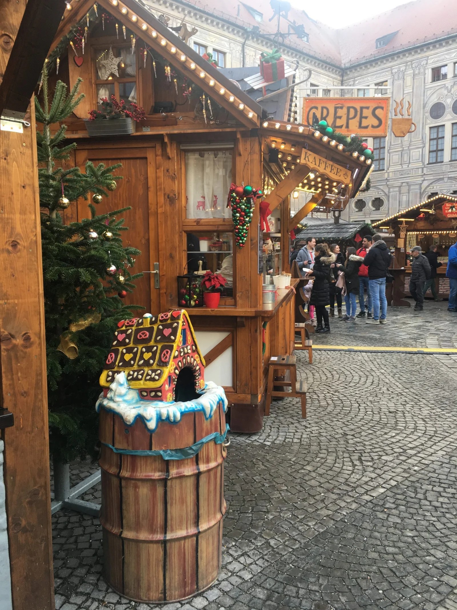 Munich is just so beautiful at Christmastime. I love the huge wooden pyramids and how they hang pretty decorations in the trees. By evening we arrived at Winterzauber auf dem Viktualienmarkt. I had been here in July 2010 and enjoyed a huge pretzel with a beer. It appears most of the little farmers market stalls are open all year.