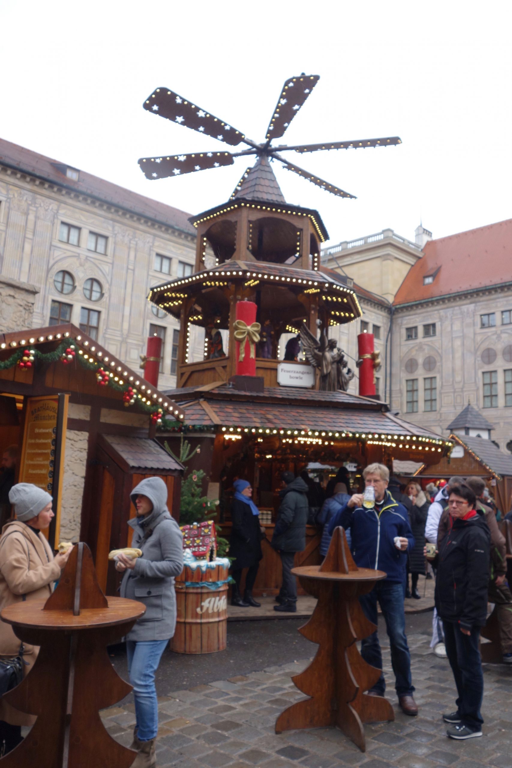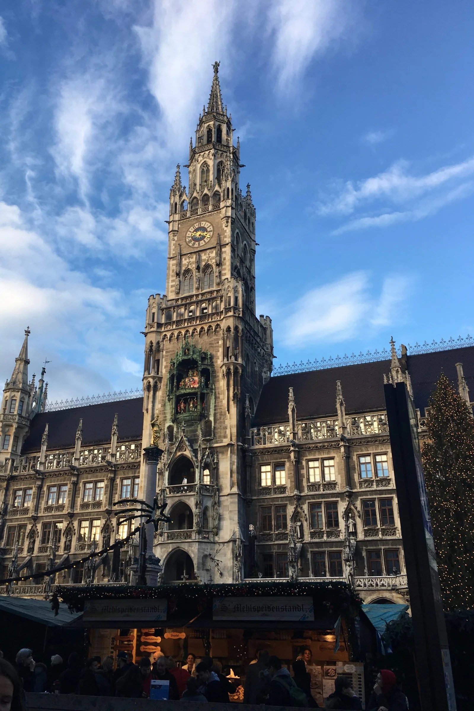 The tallest thing in Marienplatz is the huge Christmas tree in all its glistening glory. The glow of the candles makes for a great ambiance for our first evening in Munich.