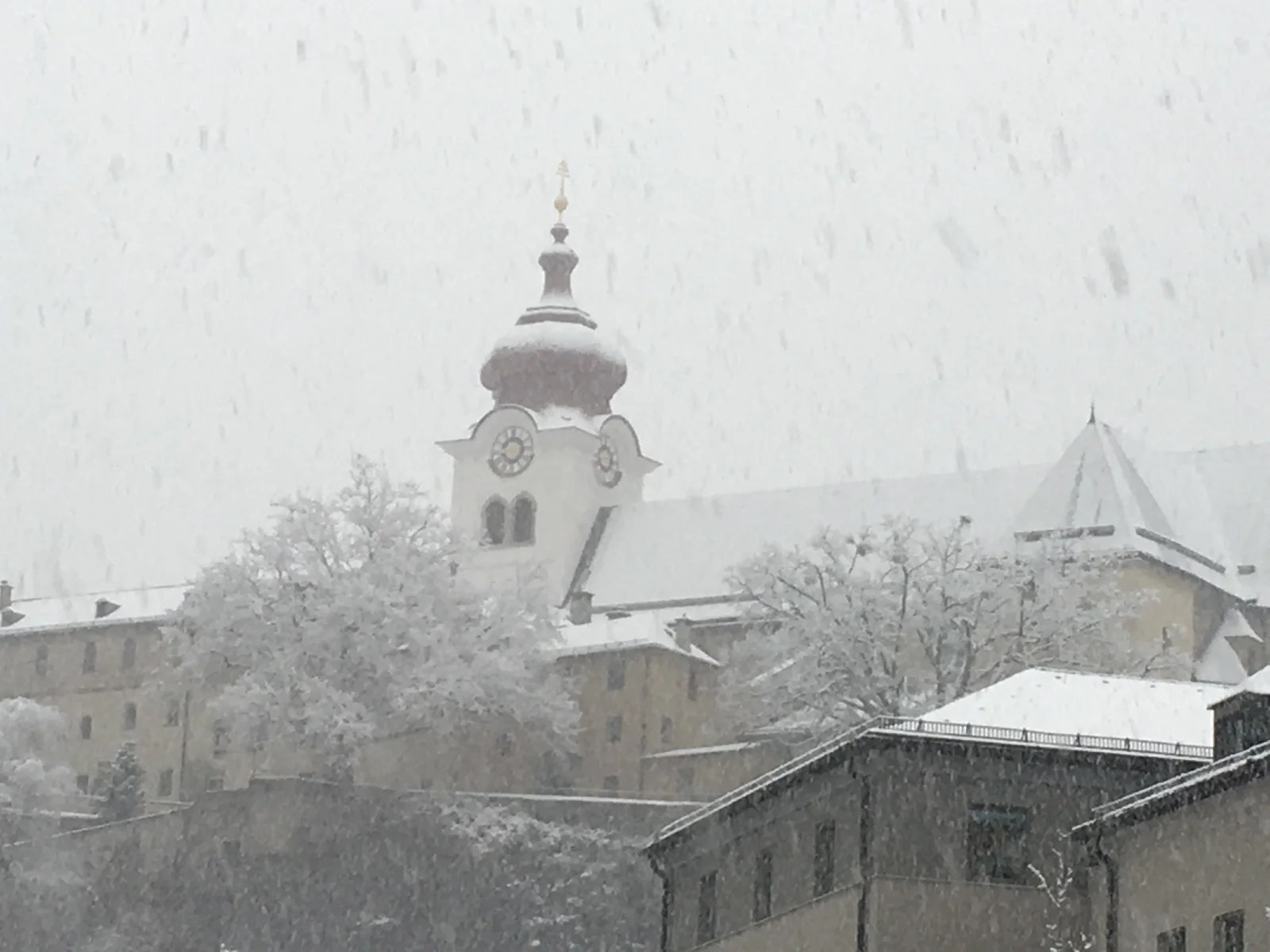 It is snowing like crazy as we met our guide up the street from our hotel. Some guests didn’t take the hilly and slippery terrain of Salzburg into consideration when choosing their footwear to trace the steps of Maria. Our guide walked us to the Nonnberg Abbey where the story began. The nuns sang “Maria” in the courtyard and the kids visited her here. We didn’t go inside and were told neither did the actors. Hollywood magic.