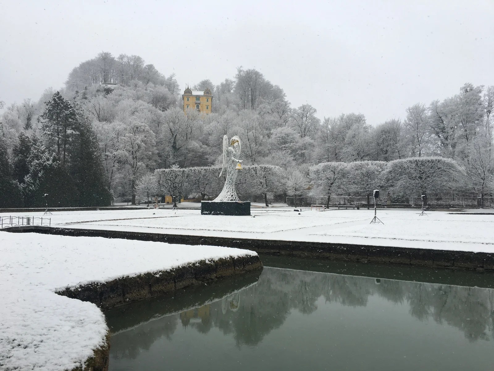 Thankfully the snow began to let up, just when we were boarding the motor coach. We drove to a familiar place. Weren’t we just here the yeserday? Yep, Hellbrunn Palace! It is where the gazebo in which Liesl sings “16 going on 17” was relocated. It was originally in the park of Leopoldskron Palace. What – Jan didn’t know this? We laughed because we were only a hundred feet away from it the prior day. Jan gave us a little sample of the song. I didn’t get it recorded though. Darn!