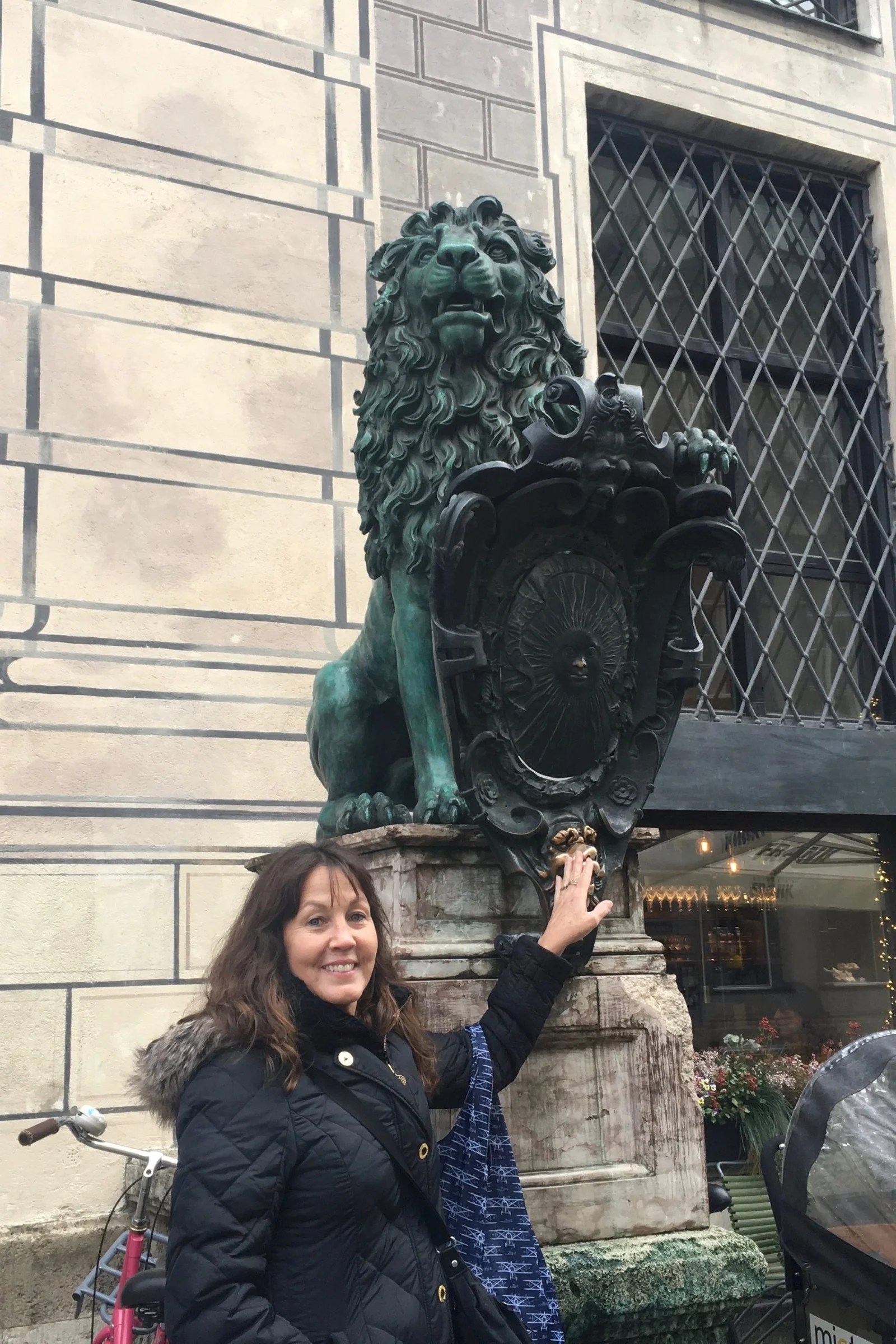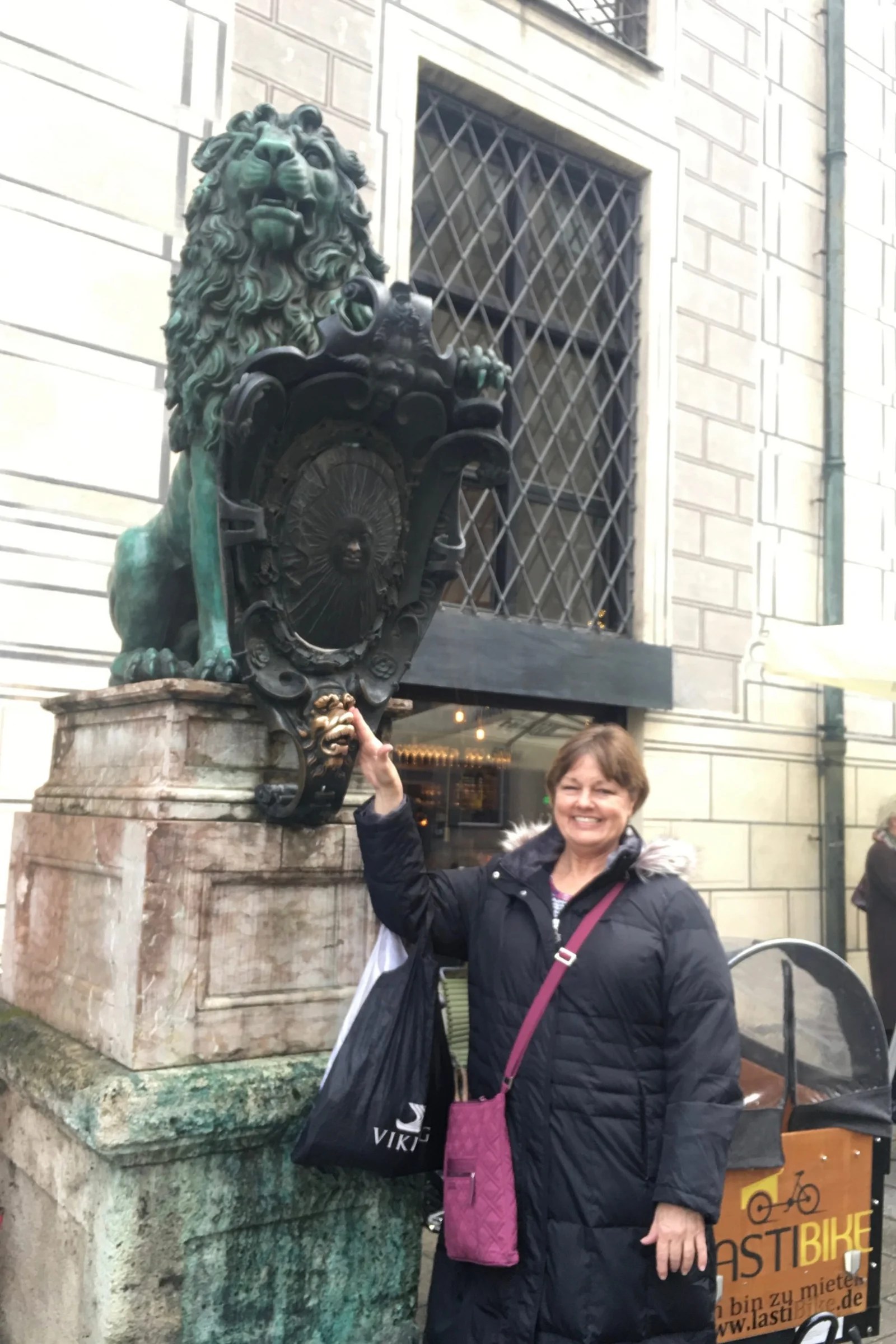 The large motorcoach returned to city center. Peter did a great job navigating the narrow streets. He stopped near the historical hub, and we started the walking portion of our tour at Odeonplatz. Hey, we’ve been here before too! Michael said the lion there might bring you luck, but would definitely bring you germs. Ha!