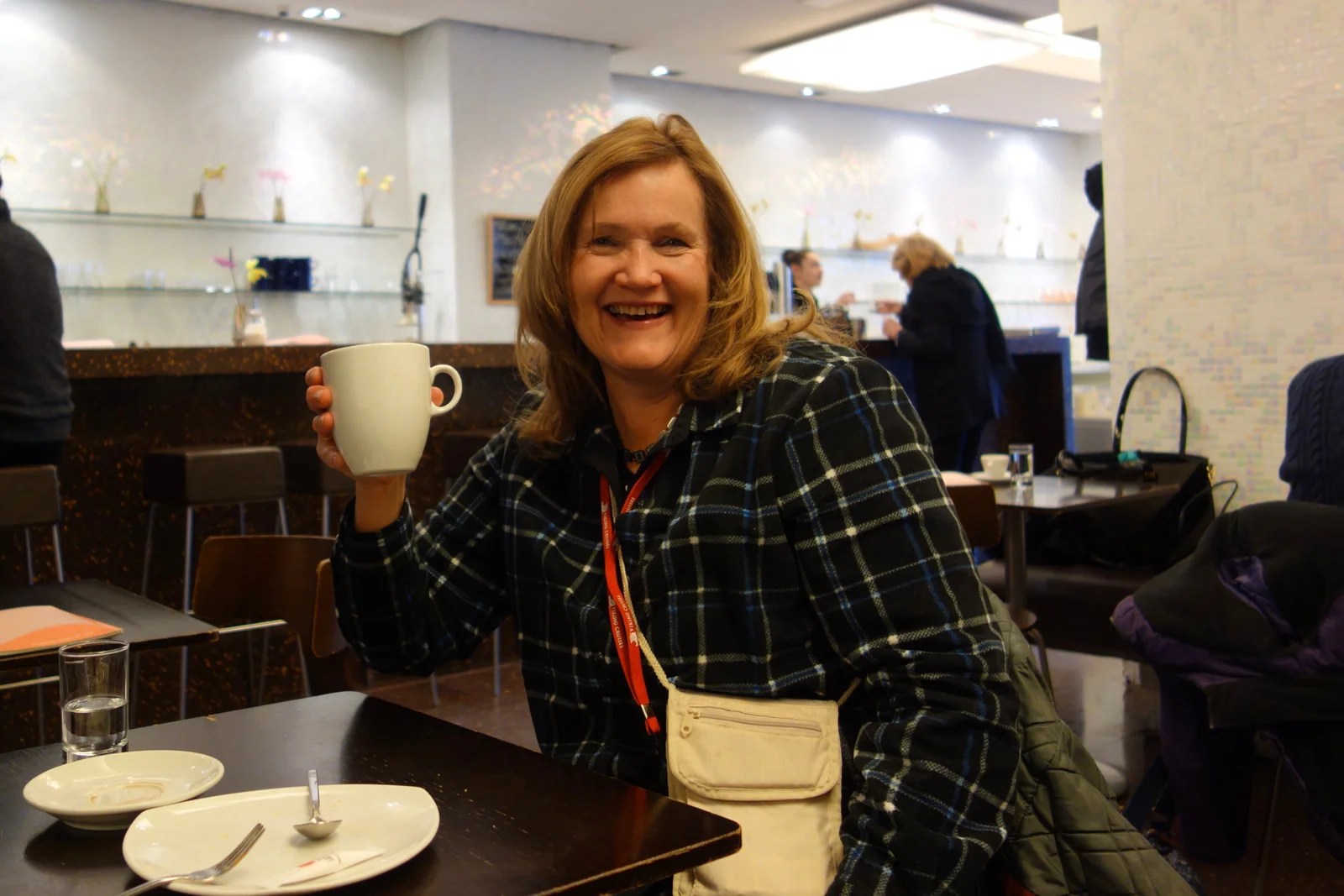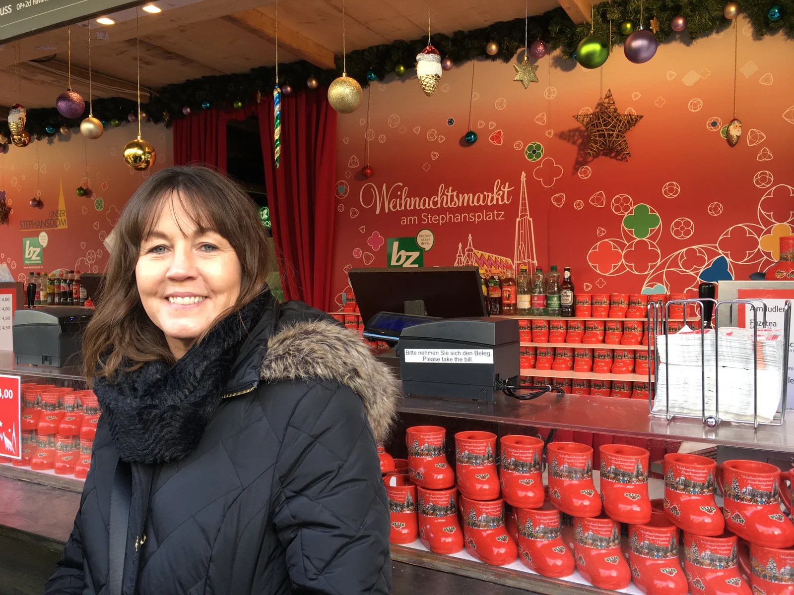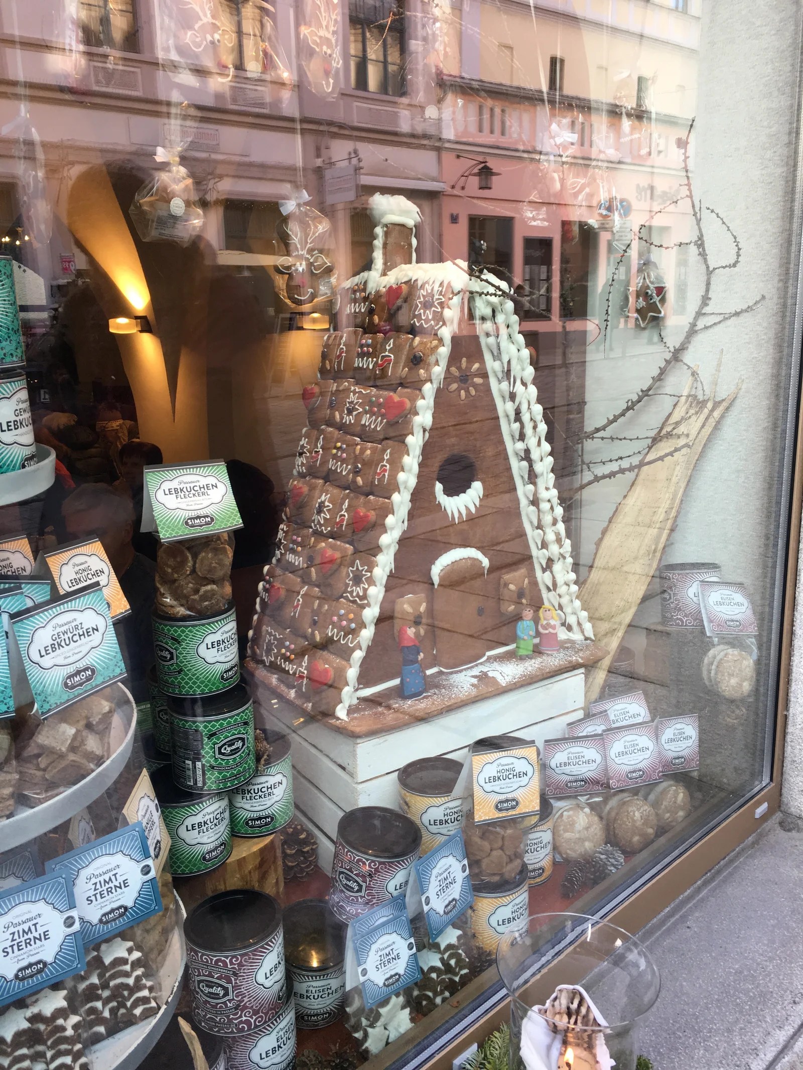 Soon we were on our way to the Christmas Market at Steiner Tor. So enjoyable! Mike and Ruth even danced to the live band, much to the musician’s delight. The Glühwein cups were just regular coffee cops so a pic would do.