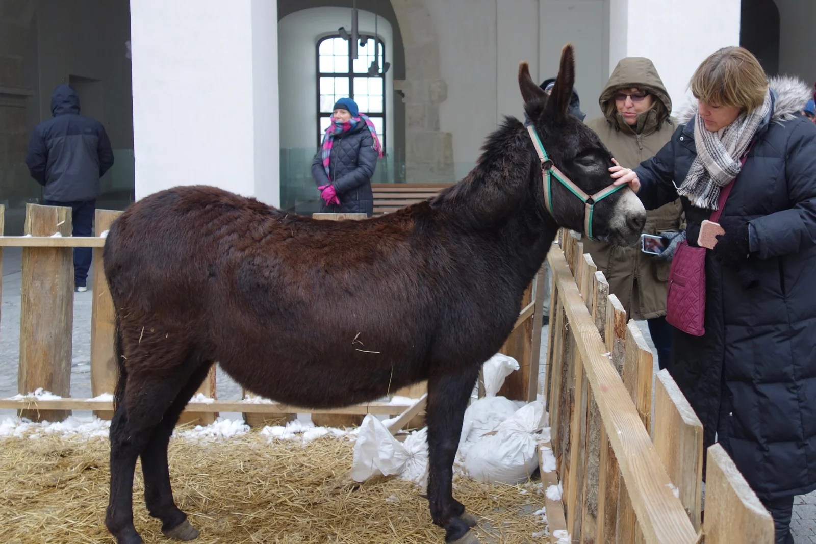 Our first stop was at the Bratislava Castle, where Uri led us up the slope to the plateau high above the Danube. The Christmas display included a carved wooden nativity and live animals. Ruth and Jan couldn’t help but give out neck rubs. There was a tiny gift shop stuffed with souvenirs including several types of Slivovitz.