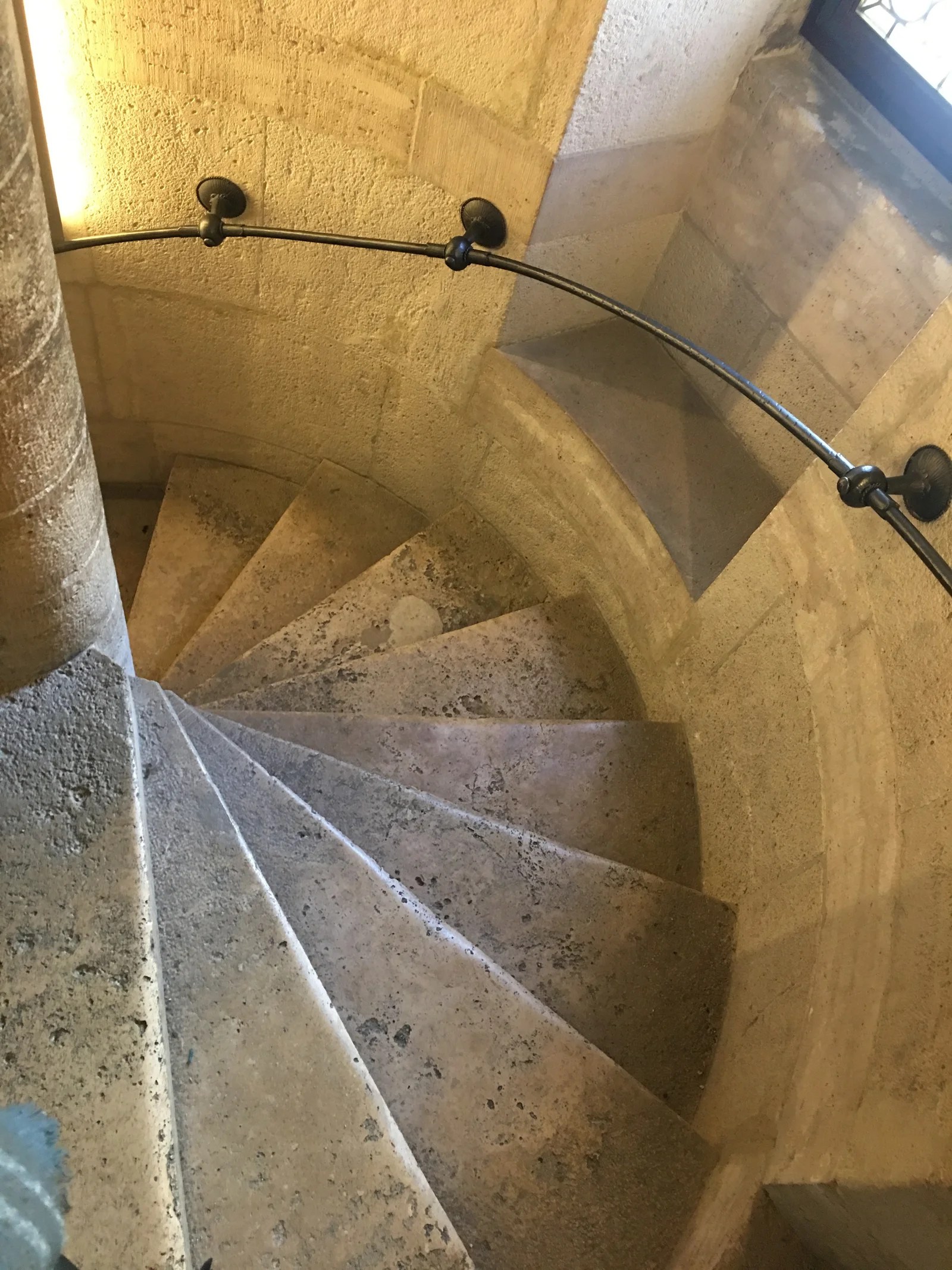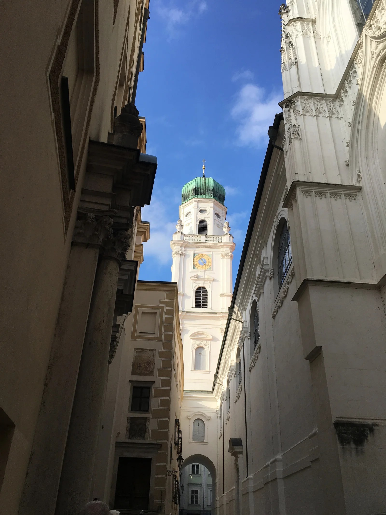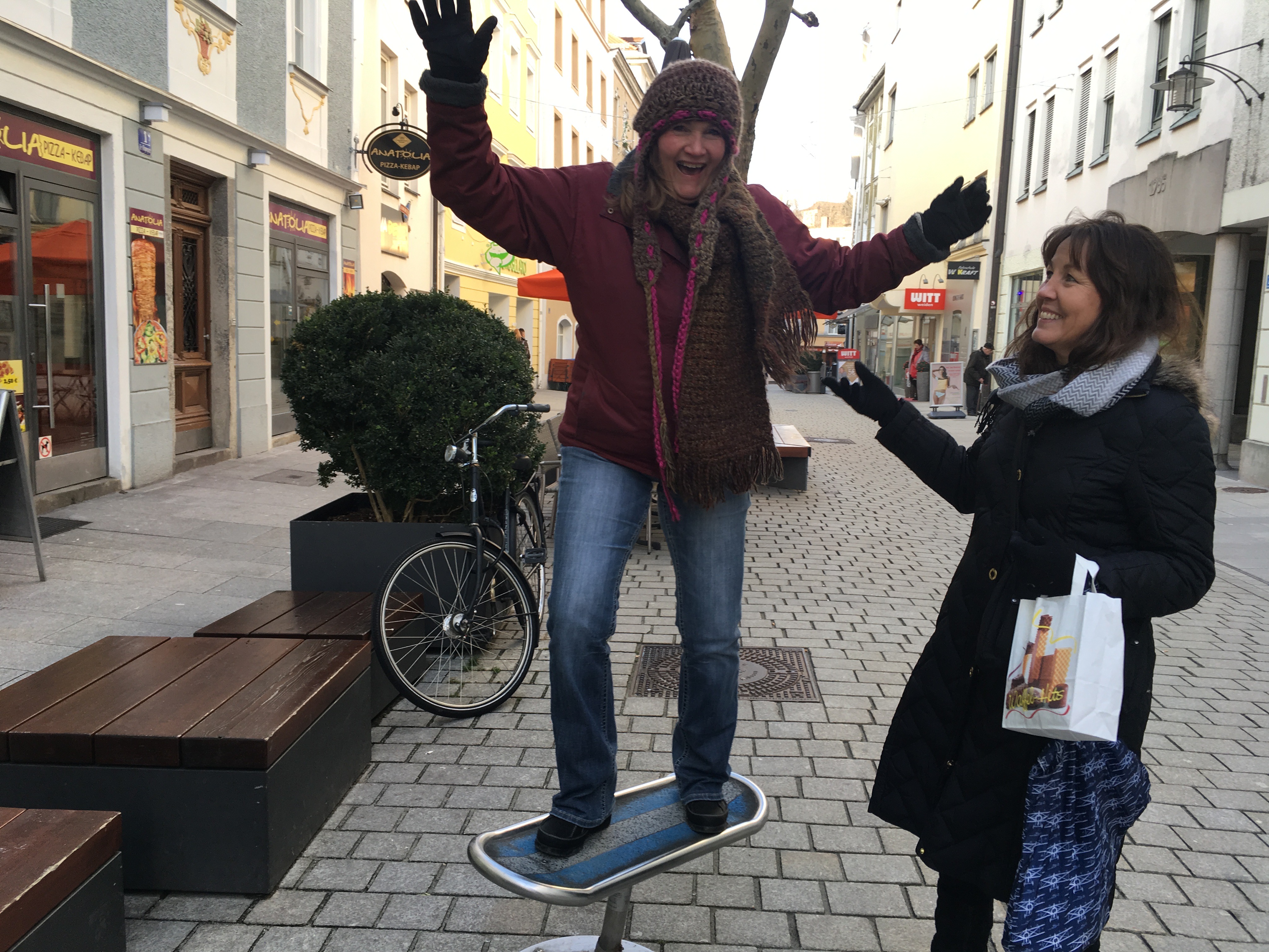Around the corner of land’s end, we strolled up the bank of the Inn River just before it empties into the Danube. Pilgrimage Church Mariahilf which was built in the 1620’s could be seen across the water just above the town of Innstadt. The staircase of 321 steps (the heavenly ladder) leads up the steep slope to the miraculous image (a painting of the Virgin Mary) inside the abbey. Some people go up on their knees as they pray on each step.