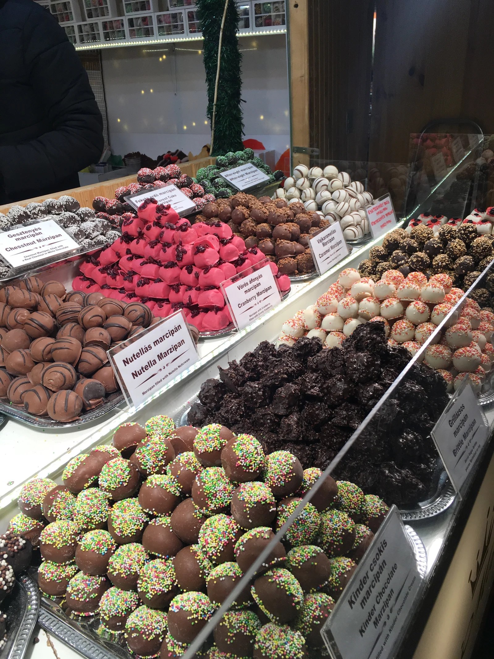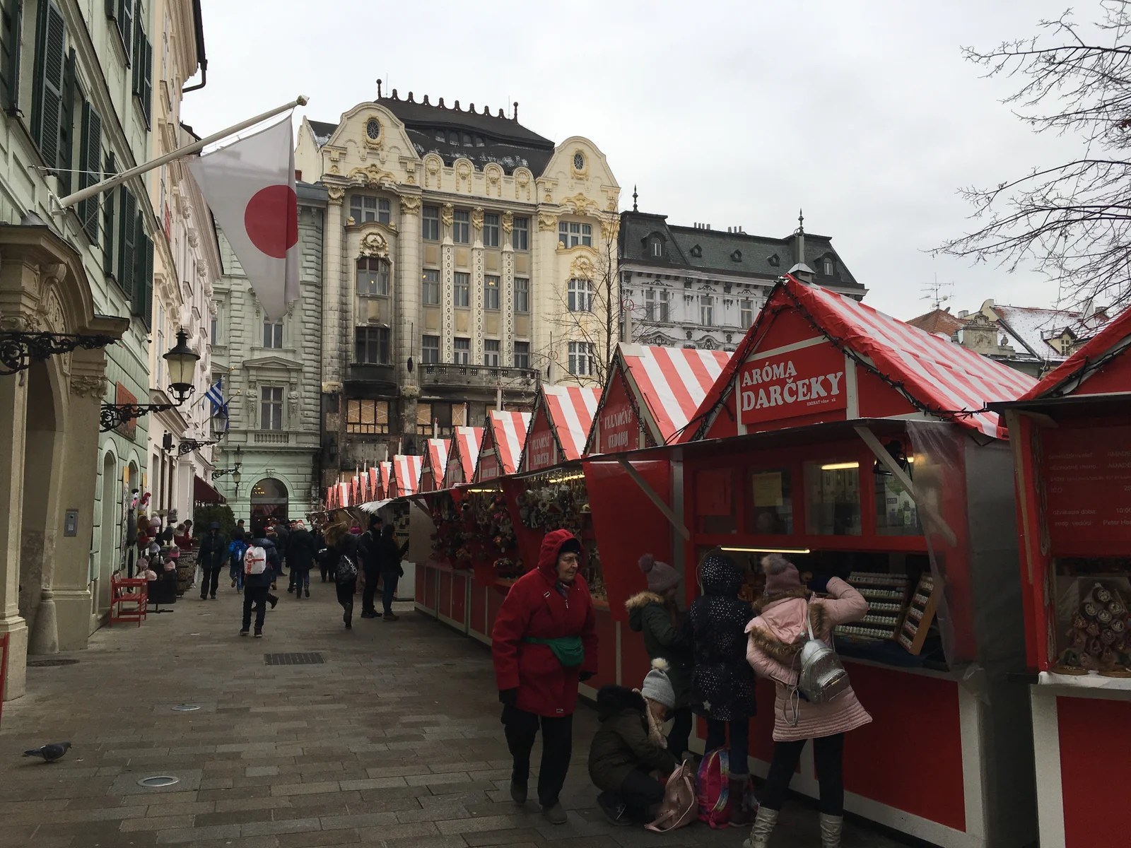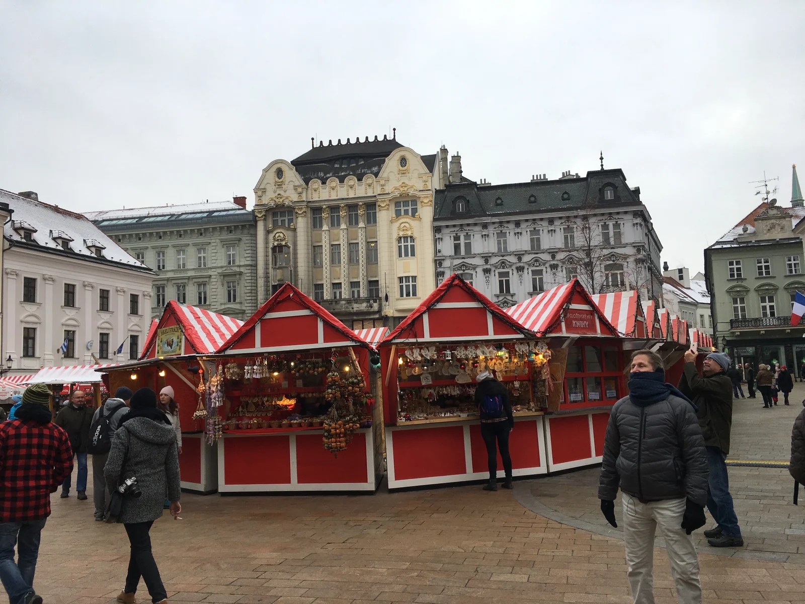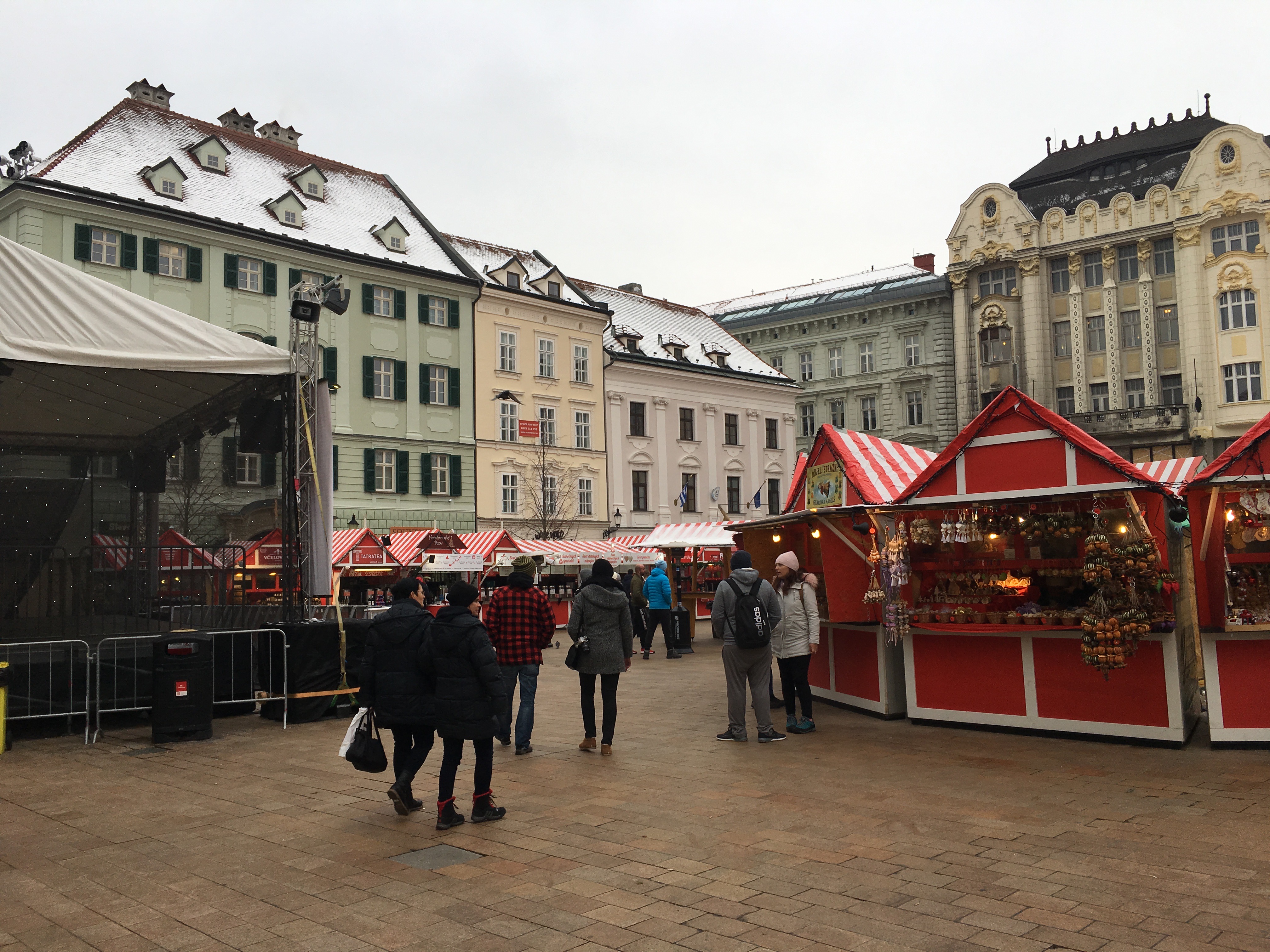 At the Christmas Market, we tried a burrito like food and a Slovakian “Black Bear” black currant mulled wine. The food was strange (glad we shared) but the hot beverage was tasty. I wish we could have sampled the honey mead. I bought a cute ceramic bell ornament, a bottle opener and some chocolate.