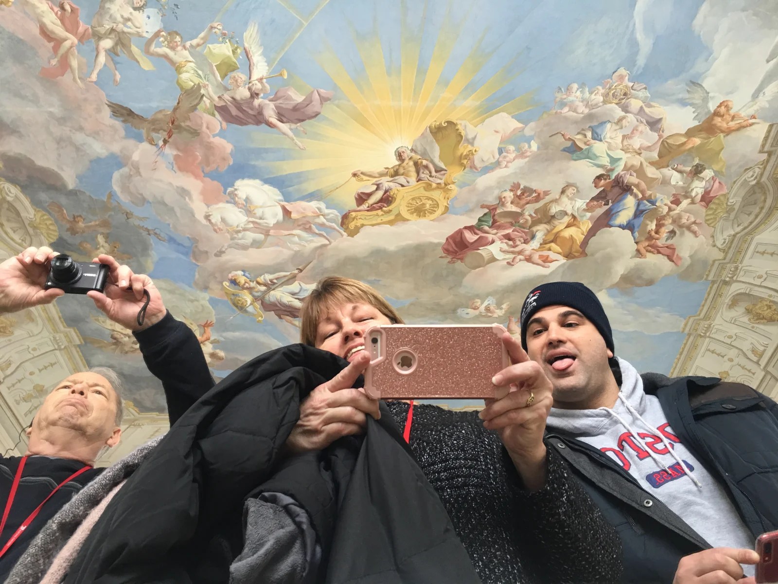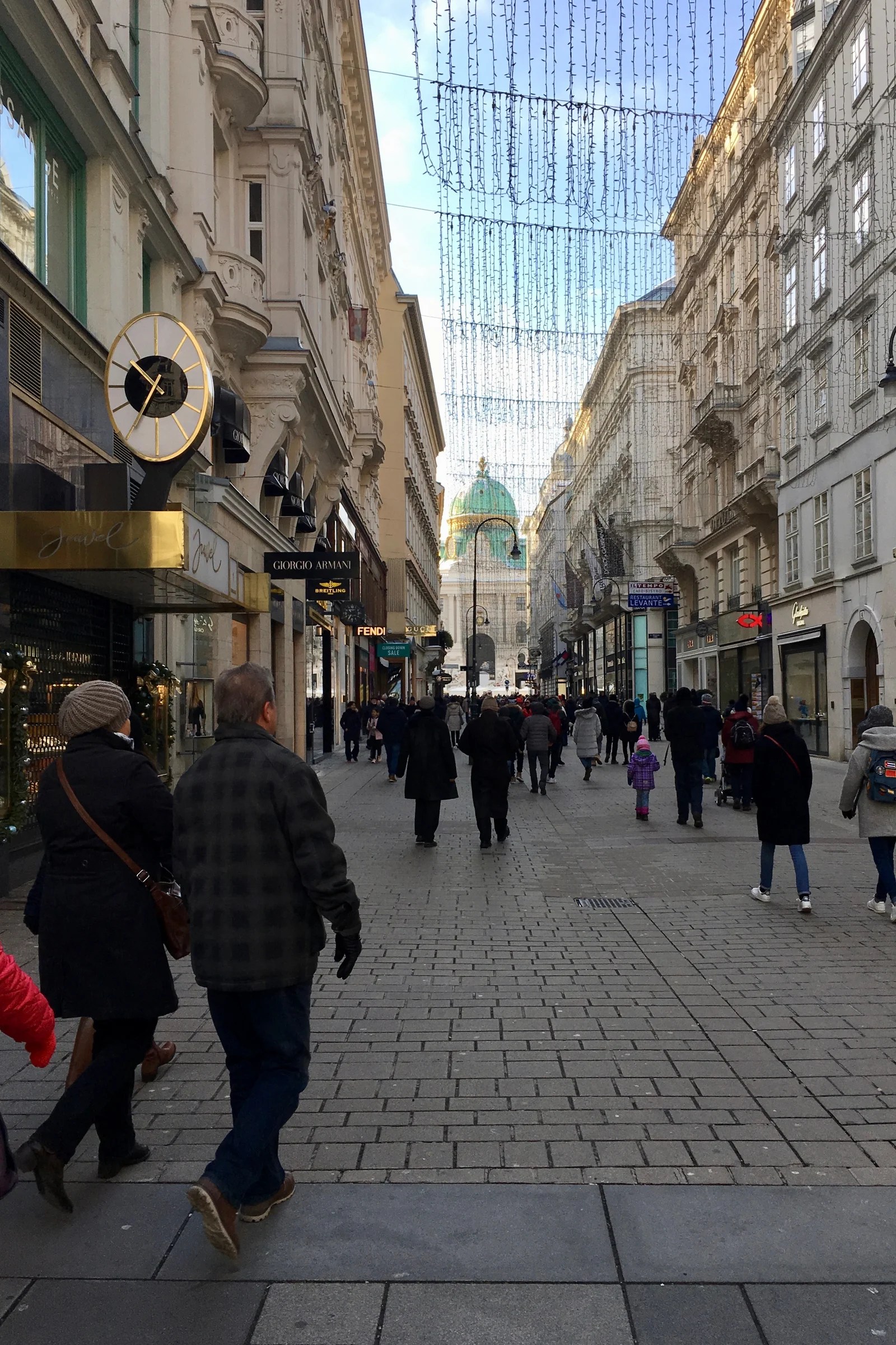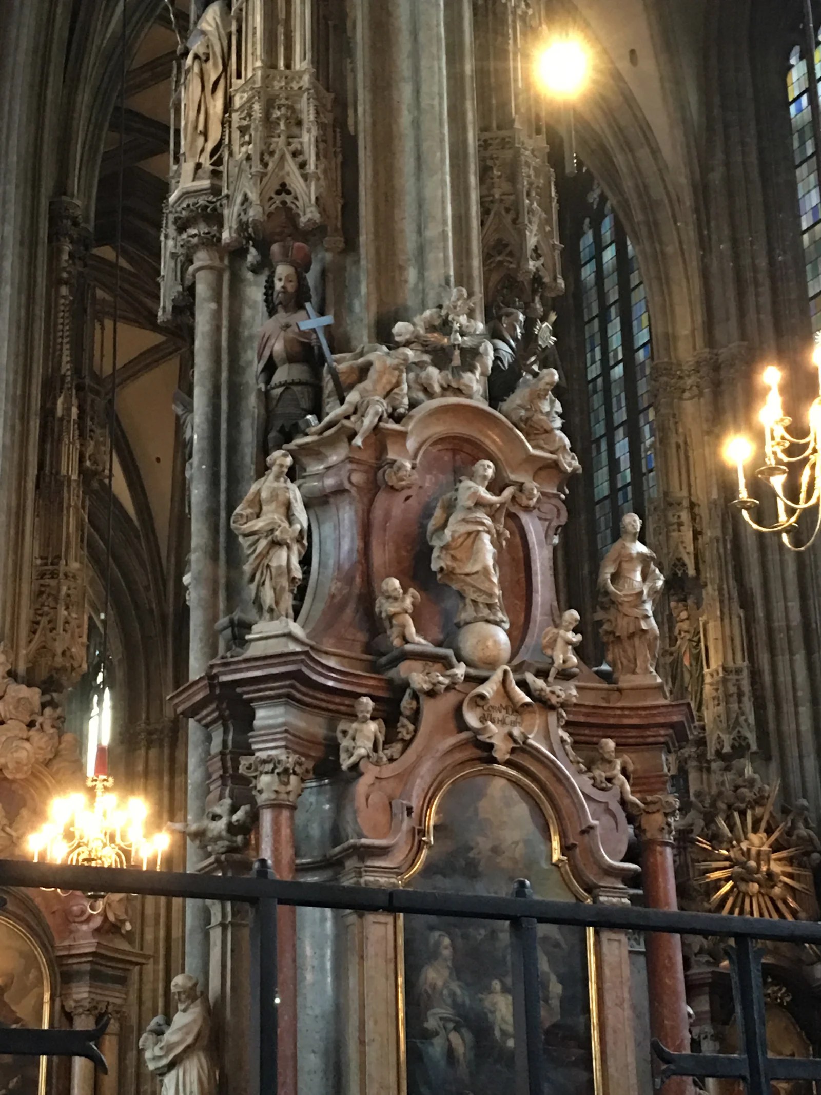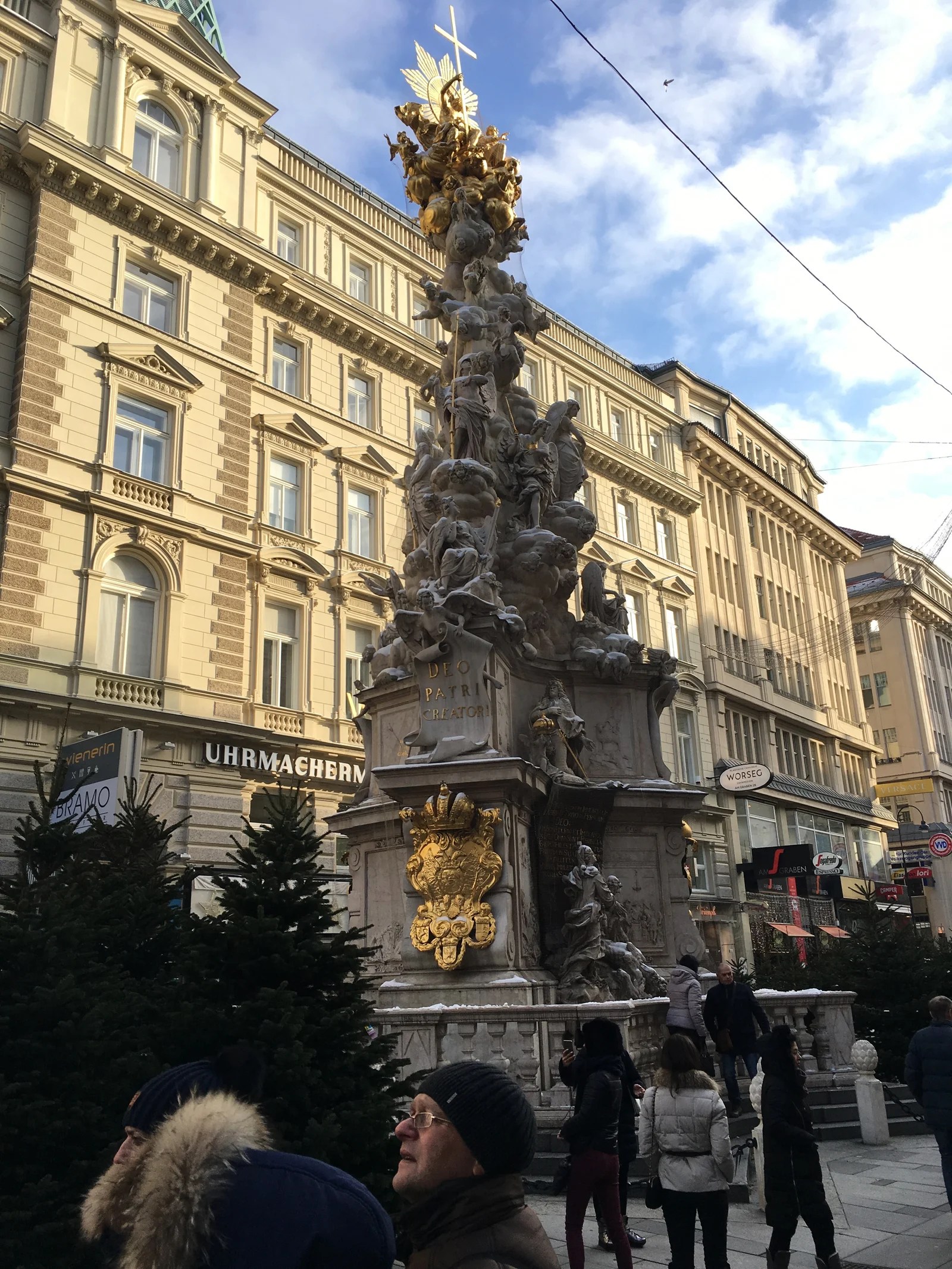 Our walk continued through the heart of Vienna down the “shopping Street” Kaerntnerstrasse, with its premium luxury names: Gucci, Fendi, Armani, Chanel, Louis Vuitton, Burberry, etc. We also peeked down a street at Peter’s Church and stopped near the Plague Column to learn a bit of history. The column has complex meanings and icons. The golden top represents heaven and each face is associated with the Holy Trinity.
