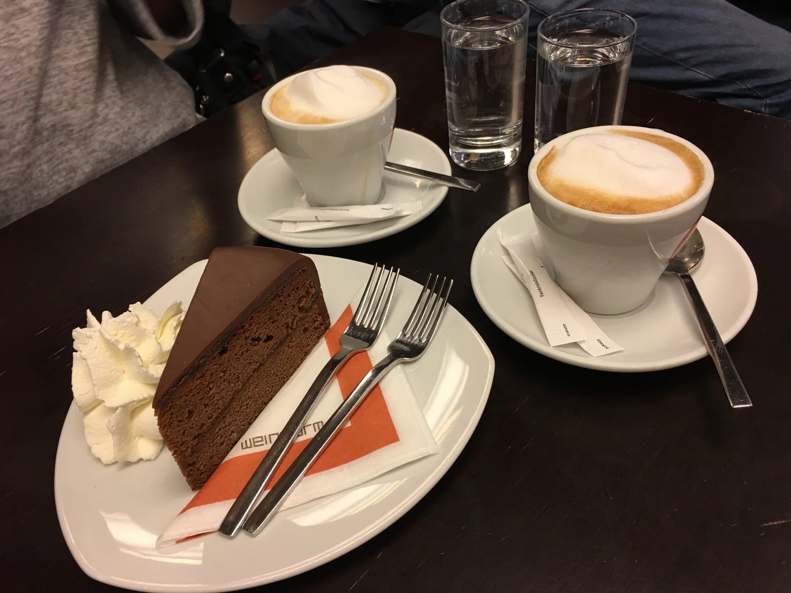 Score! Little red boot glühwein mugs. Jan and I both had to have one. Of course we enjoyed the beverage inside- a tasty Glühwein and an Apfelstrudel Punsch. I also found an ornament that looked like a mini chandelier for a certain someone’s doll house. We popped into M Weinwurm & Sohn Cafe for Mélange and Sachertorte. So delicious!
