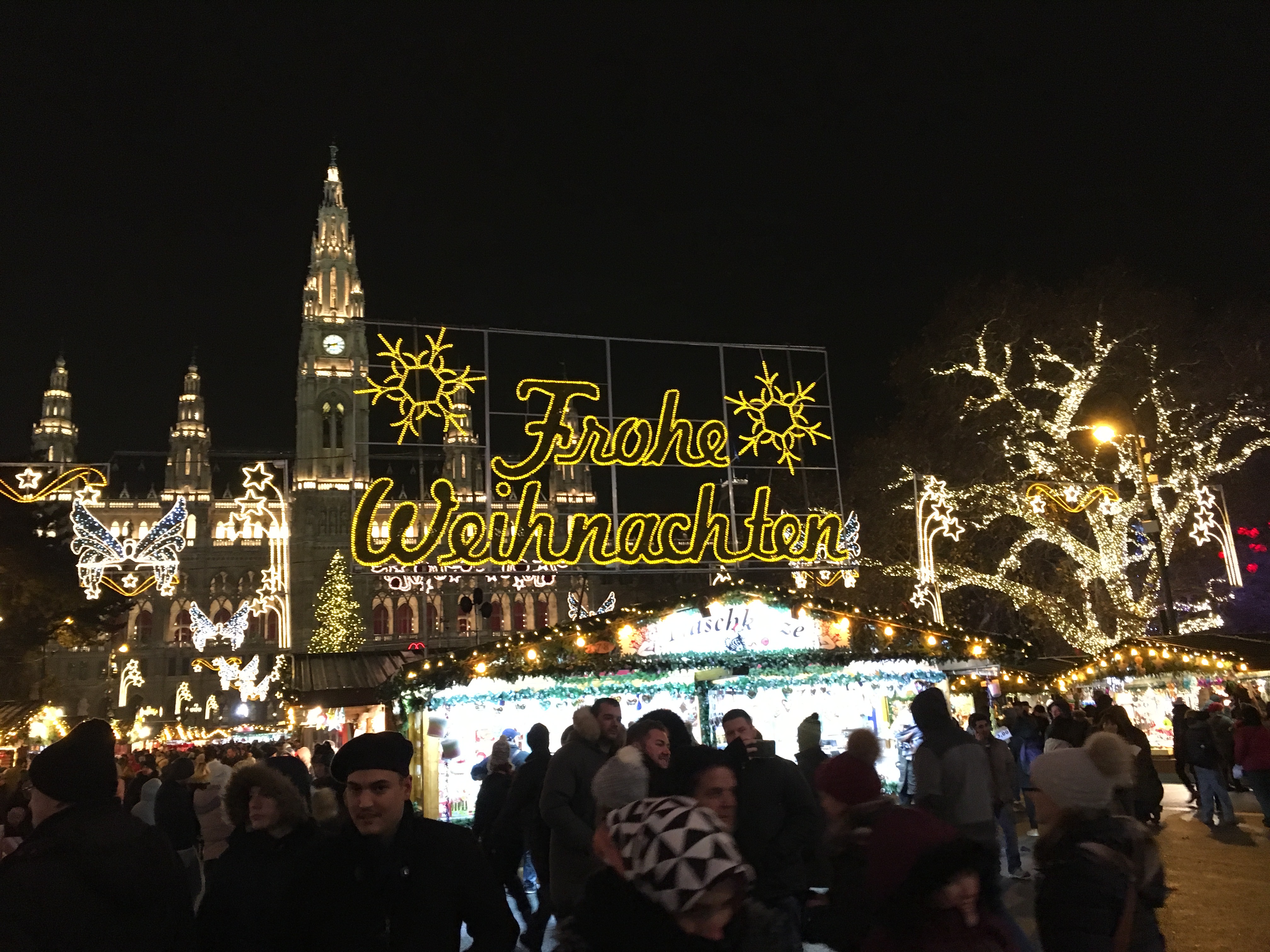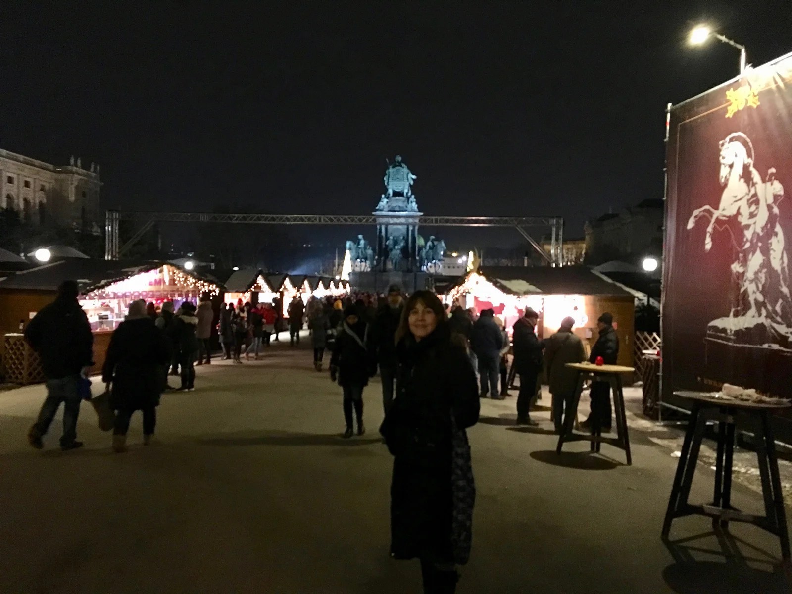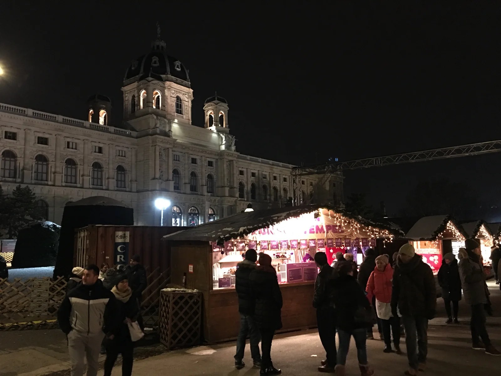 Maria-Theresaplatz was our next stop and it was prettier in all lit up in the dark. More little boot mugs and friendly people.